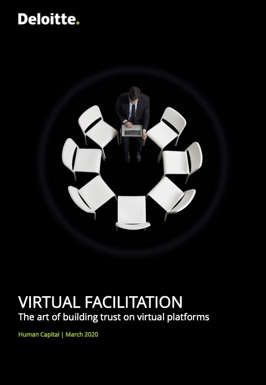 March 2020: The COVID-19 pandemic is about to unfold. Deloitte publishes a PDF titled 'VIRTUAL FACILITATION—The art of building trust on virtual platforms using Microsoft, PowerPoint, for Office 365. The A4 PDF has 17 pages but only because it's designed like a slide deck. The font size consistently hovers somewhere between 20, 20.1, and 23pt. It's mostly bullets, tables, and flow charts like step-by-step instructions on the do's and don'ts of digital video conferencing and the latest technology to spice up your digital session. Colors are limited to Deloitte Green (Pantone 368), black, gray, and white. On page 15 the font switches from Open Sans to Verdana for no particular reason. The PDF consistently emphasizes how 'virtual' this new normal is, perhaps this reflects our collective disbelief that 'this is actually happening'.