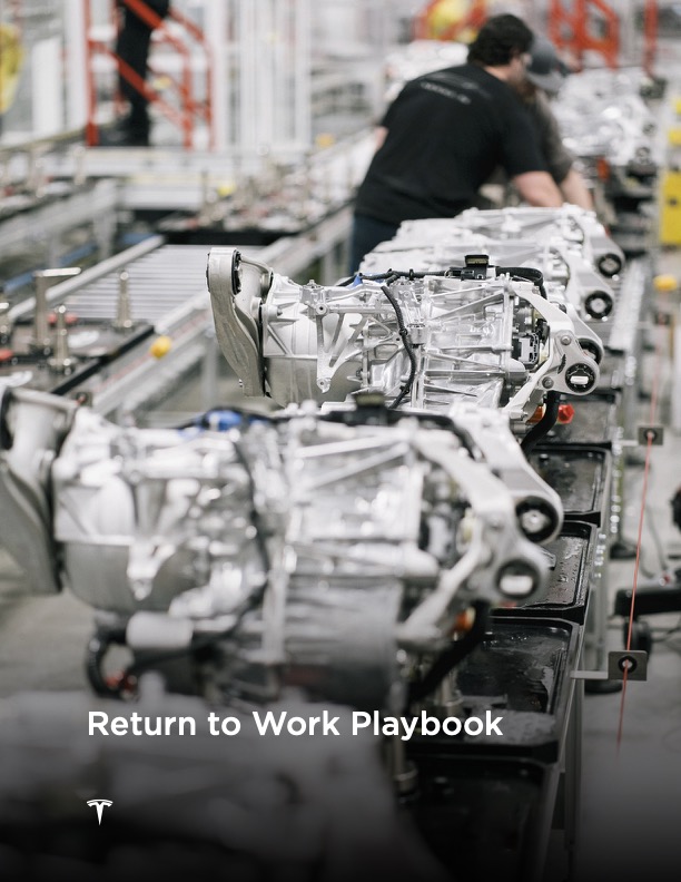 The sound of whirring machines and clanging metal is filling the air. We are inside a Tesla factory. The bright and clean environment is a testament to the cutting-edge technology that drives the company's success. The camera zooms in on an assembly line, where rows of gleaming cast aluminum engines are meticulously crafted by robotic arms. In the background, two workers hunch over one of the engines, their bodies blurred by the shallow depth of field. Their movements are swift and precise as they work in harmony with the machines to create the ultimate driving experience. Welcome to the ‘Return to Work Playbook’ by Tesla.